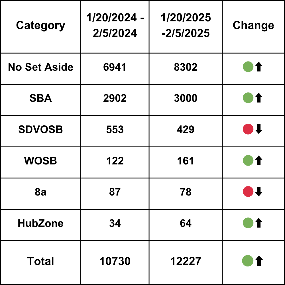 Some agencies are getting dismantled piece by piece, and contracts tied to DEI initiatives are being terminated. There’s no doubt that some parts of the federal market are seeing disruption—but that doesn’t mean opportunity has dried up. In fact, if you compare the last 16 days under the new administration to the same period a year ago, the numbers show a slight increase in opportunities on SAM.gov.